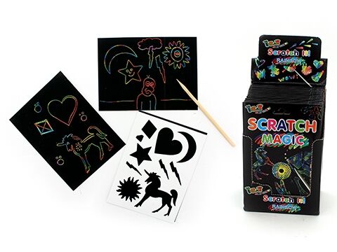 | Bring out your artistic side and create your very own multicoloured masterpieces with these awesome rainbow coloured scratch paper sets. Use the design tool to scratch away the paper’s black coating to bring your colourful drawing to life. Perfect for children’s parties or rainy days and a great way for children to express themselves. Trace the shapes of the stencils and fill them in with your own designs. Each pack includes: 2 Art sheets 1 Design tool 1 sheet of stencils With 3 different themes of stencils to try out. Product size: 13 cm x 20.5 cm x 13 cm Display box size: 14 x 30 x 10 cm Packing : 24 pcs per display box |