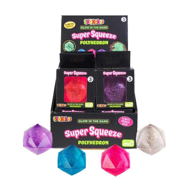 Get your hands on Smoosho’s Super Squeeze Glitter Polyhedron! Its dynamic shape is ideal for firm, satisfying squeezes, with just the right balance of squishiness and strength. Plus, it’s full of glorious glitter! Mould it however you like, because no matter how slow, it will always return to normal. It’s geometric fun!
